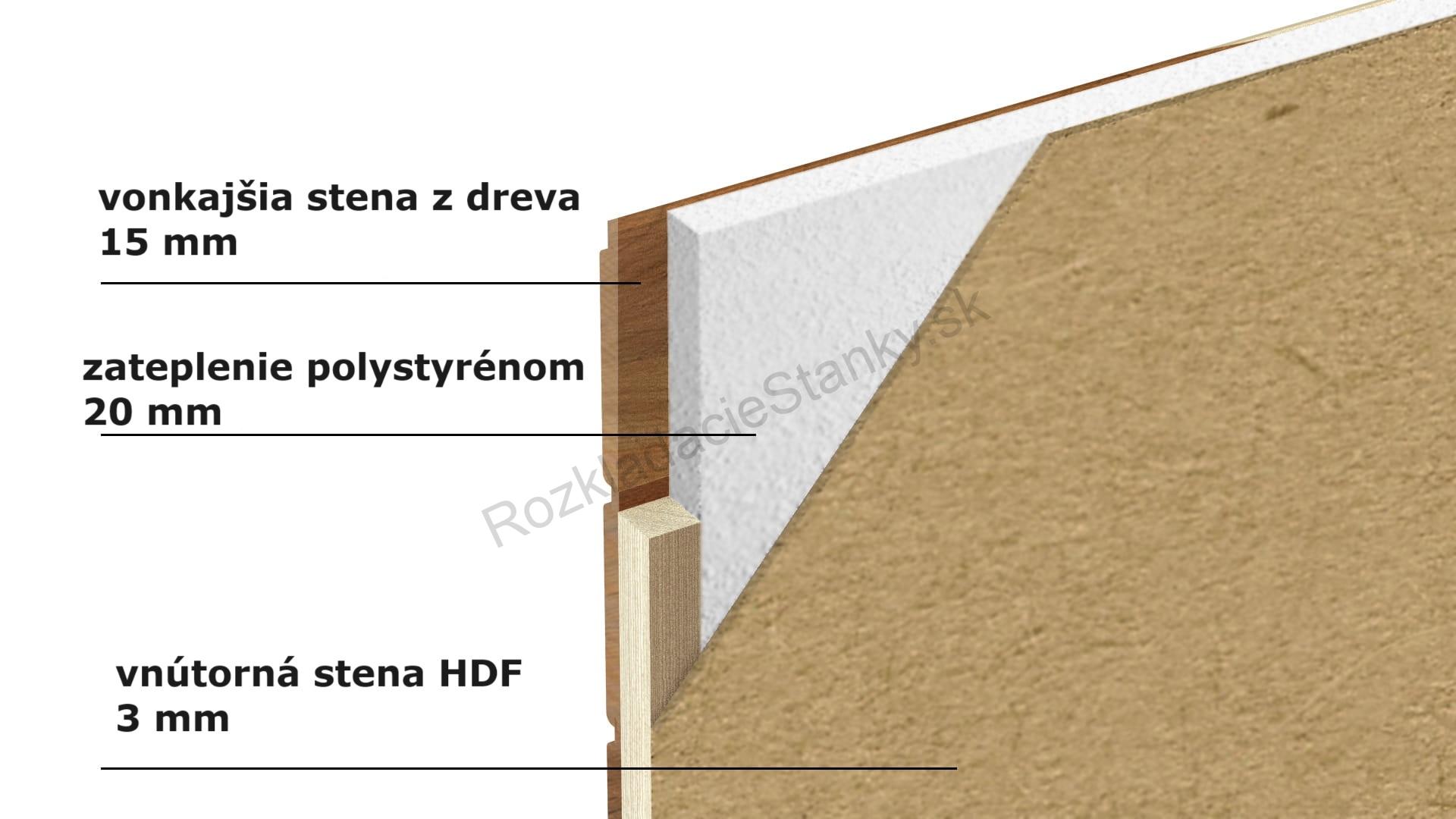 Teplo za každého počasia: 1,5 cm hrubé steny zo sušeného borovicového dreva sú izolované 2 cm vrstvou polystyrénu a pokryté HDF doskou – čo zaručuje tepelný komfort. Konečná hrúbka steny je takmer 4 cm.