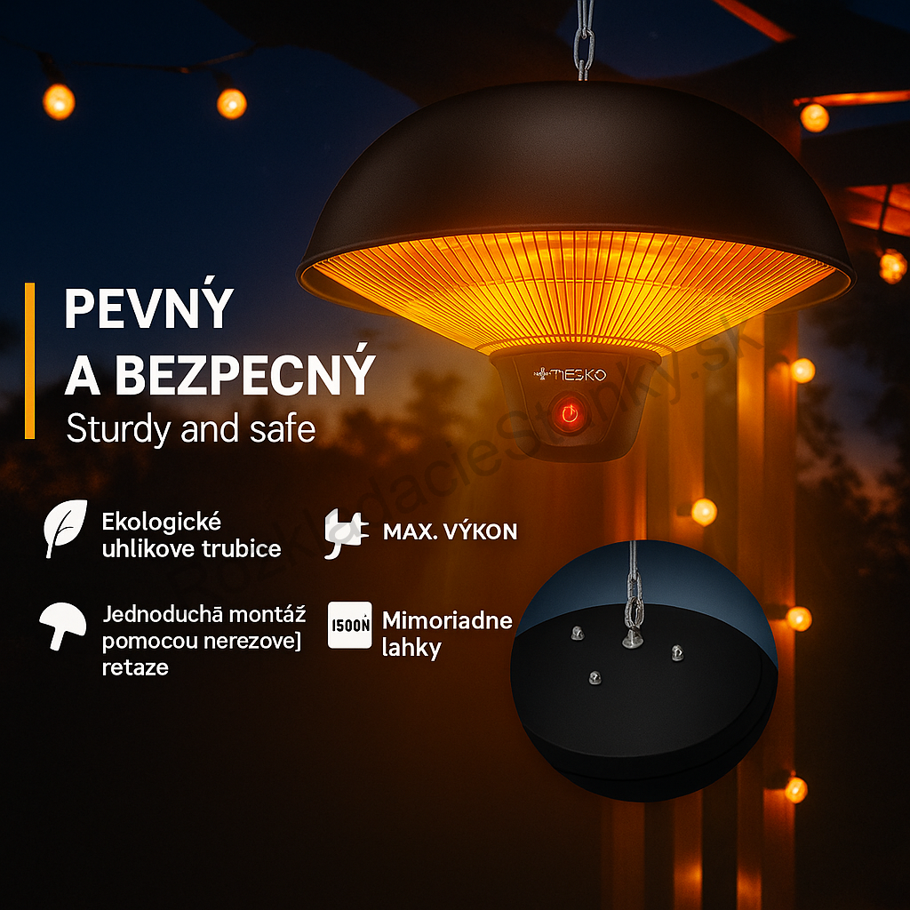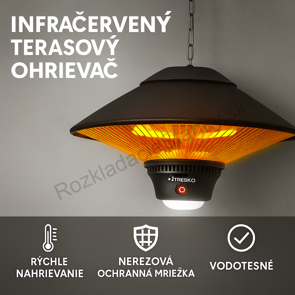 Elektrický sálavý ohrievač s 3 stupňami ohrevu, bodové svetlá na terasu do interiéru aj exteriéru, infračervený ohrievač na terasu, terasový ohrievač